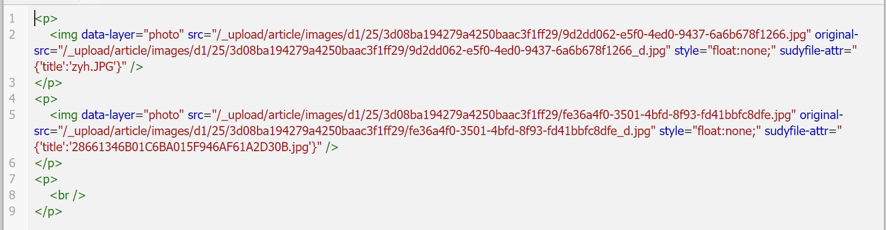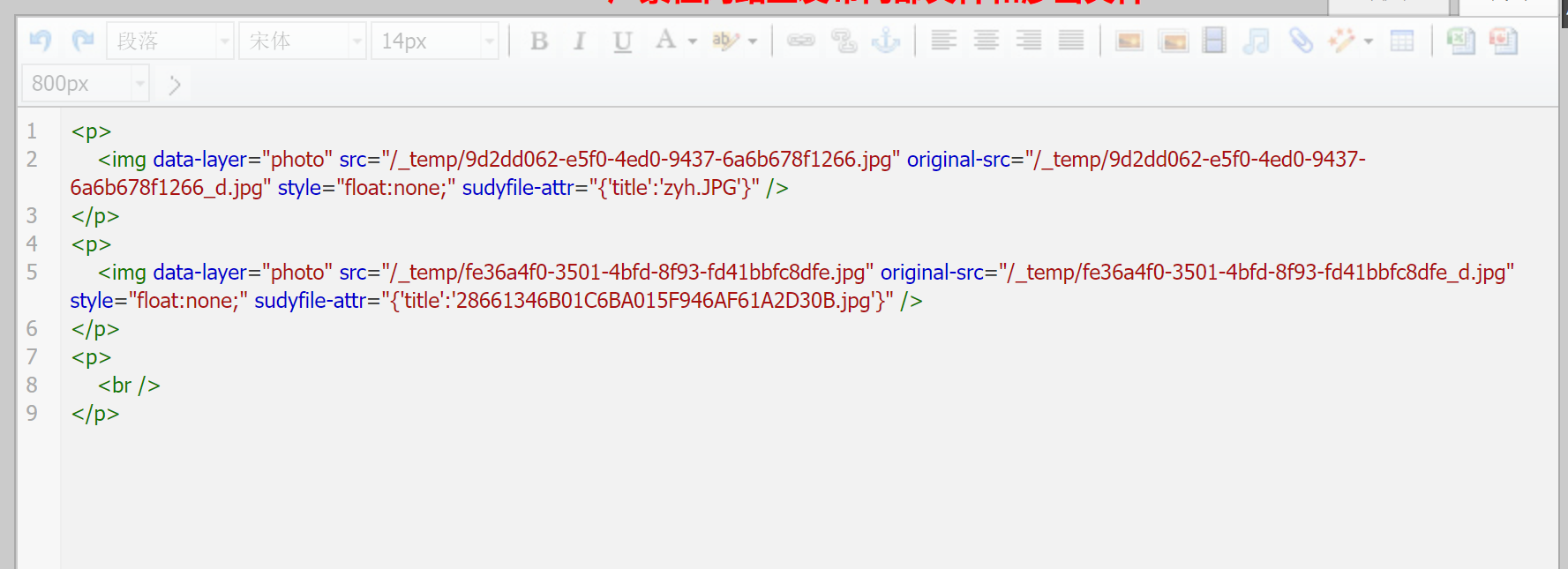 - 这一步的目的是获得图片的最终URL,你需要使用上传图片功能,将所有同学提供的照片上传上去,然后保存一次,然后重新进入webplus编辑器页面,进入代码界面,你应当能看到类似以下内容: